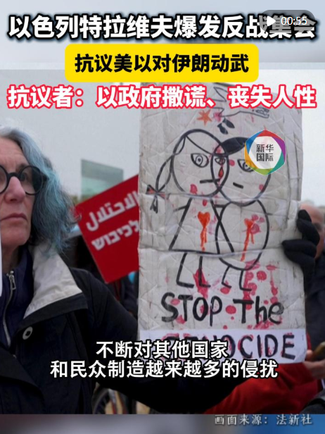 21日,大批民眾在以色列特拉維夫一處廣場(chǎng)集會(huì),抗議美國(guó)和以色列對(duì)伊朗動(dòng)武,呼吁美以停止對(duì)伊朗的軍事行動(dòng)??棺h者說(shuō),以色列政府欺騙民眾,其行為“喪失人性”,戰(zhàn)爭(zhēng)只會(huì)讓無(wú)辜民眾喪失性命,希望以和平方式解決問(wèn)題。