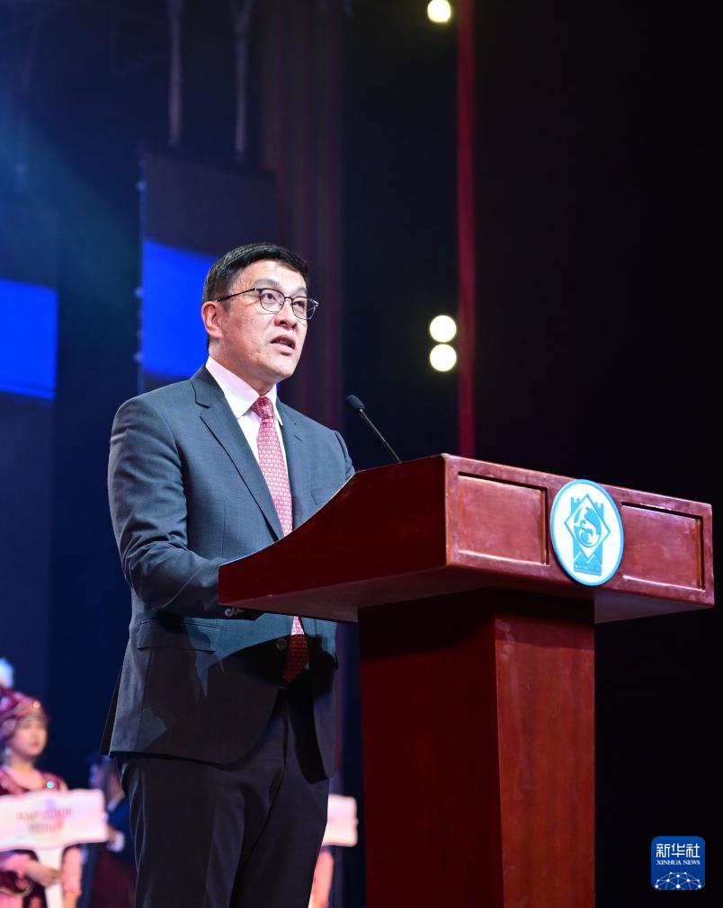 3月24日,在吉爾吉斯斯坦首都比什凱克,比什凱克市市長(zhǎng)朱努沙利耶夫在開(kāi)幕式上致辭。新華社記者 李任滋 攝