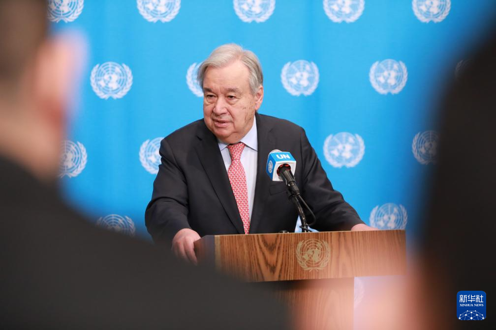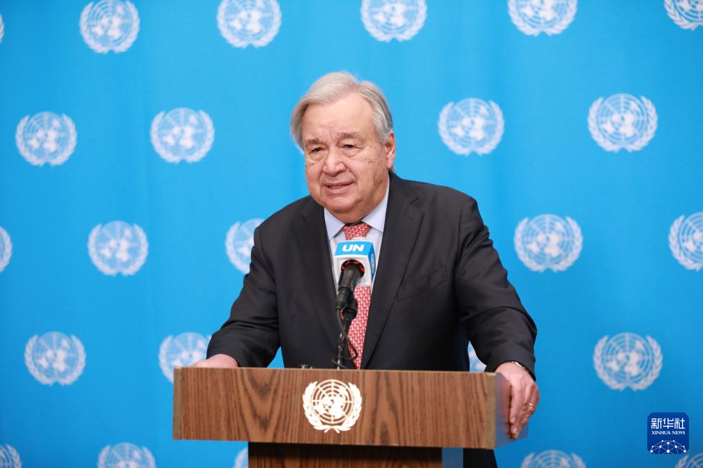3月25日,聯(lián)合國(guó)秘書長(zhǎng)古特雷斯在位于紐約的聯(lián)合國(guó)總部舉行的記者會(huì)上講話。新華社記者 謝鍔 攝