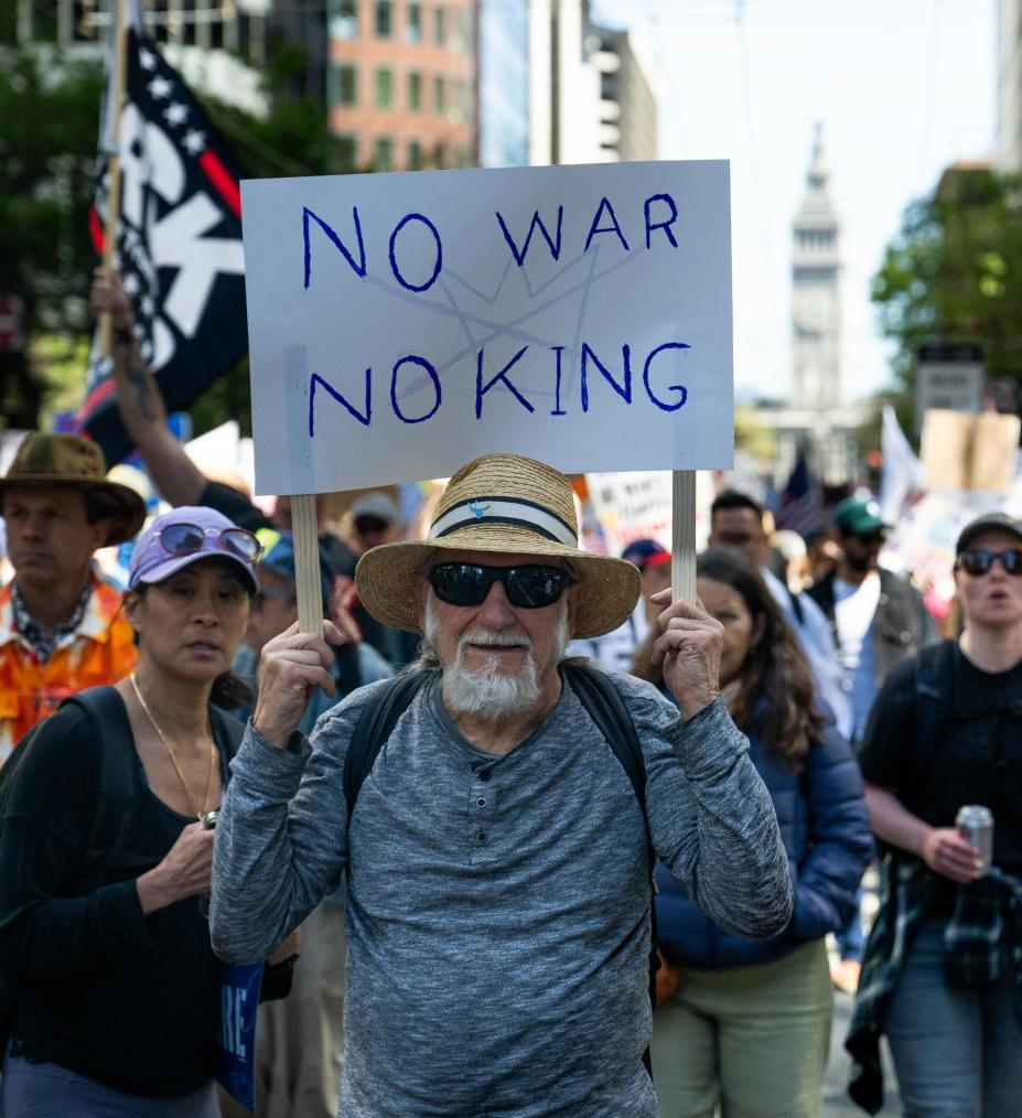 3月28日,人們?cè)诿绹永D醽喼菖f金山參加“不要國王”抗議活動(dòng)。新華社發(fā)(朱子于攝)
