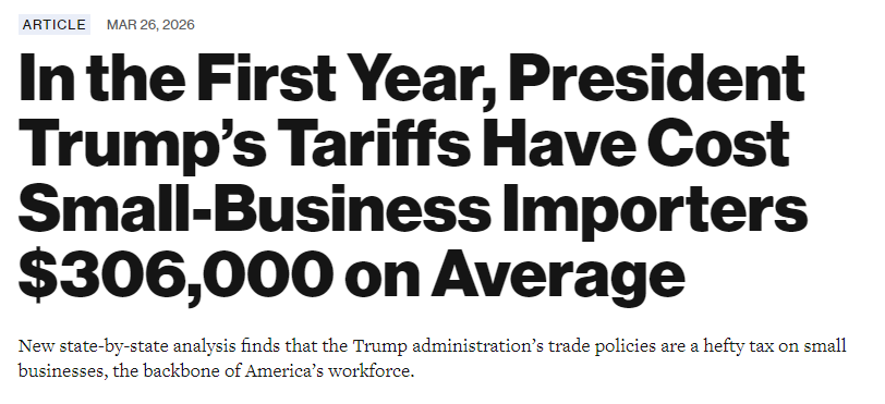 美國(guó)政府“解放日”關(guān)稅的大棒已經(jīng)揮了一年,但種種跡象表明,聲稱將大力提振美國(guó)本土工業(yè)基礎(chǔ)的關(guān)稅政策卻未能重振制造業(yè),反而讓小企業(yè)背負(fù)了沉重的賬單。美國(guó)進(jìn)步中心一項(xiàng)覆蓋全美的最新分析顯示,美國(guó)政府的貿(mào)易政策實(shí)際上對(duì)作為美國(guó)勞動(dòng)力支柱的小企業(yè)征收了高額稅負(fù)。