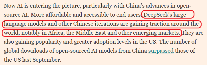 在人工智能領(lǐng)域,文章提到,以DeepSeek為代表的中國(guó)開(kāi)源大模型正不斷擴(kuò)大海外影響力。憑借更低的成本與更易獲取的使用門檻,中國(guó)大語(yǔ)言模型在非洲、中東等新興市場(chǎng)受到廣泛關(guān)注。文章稱,相關(guān)模型應(yīng)用增加后,可能進(jìn)一步帶動(dòng)預(yù)測(cè)性維護(hù)、數(shù)據(jù)分析和智慧基礎(chǔ)設(shè)施管理等服務(wù)需求,從而對(duì)知識(shí)密集型服務(wù)出口形成支撐。