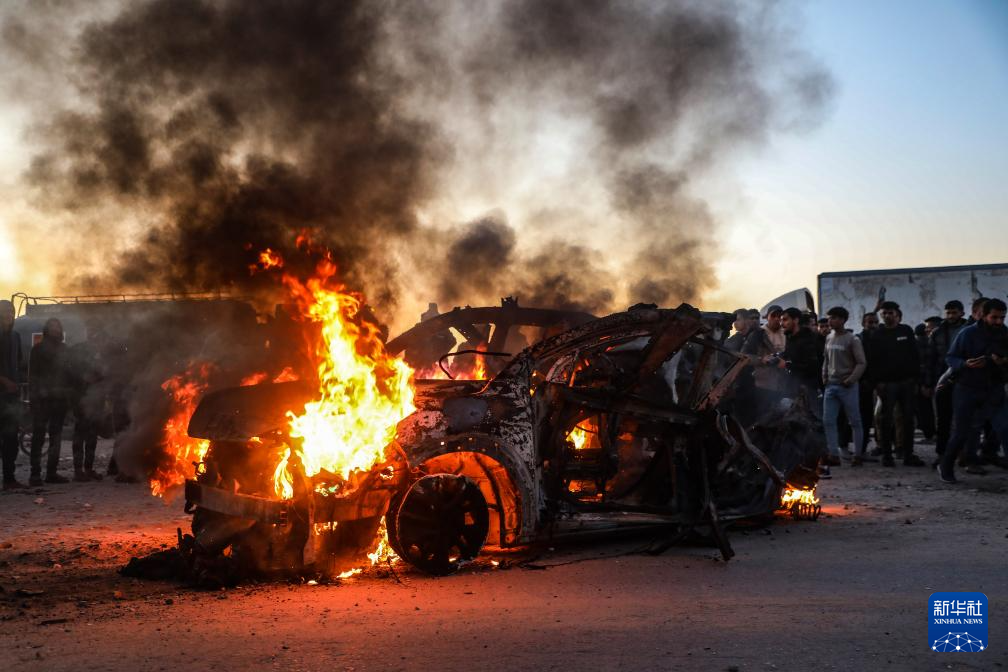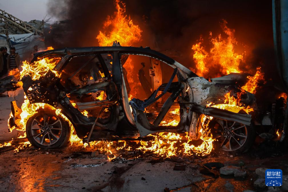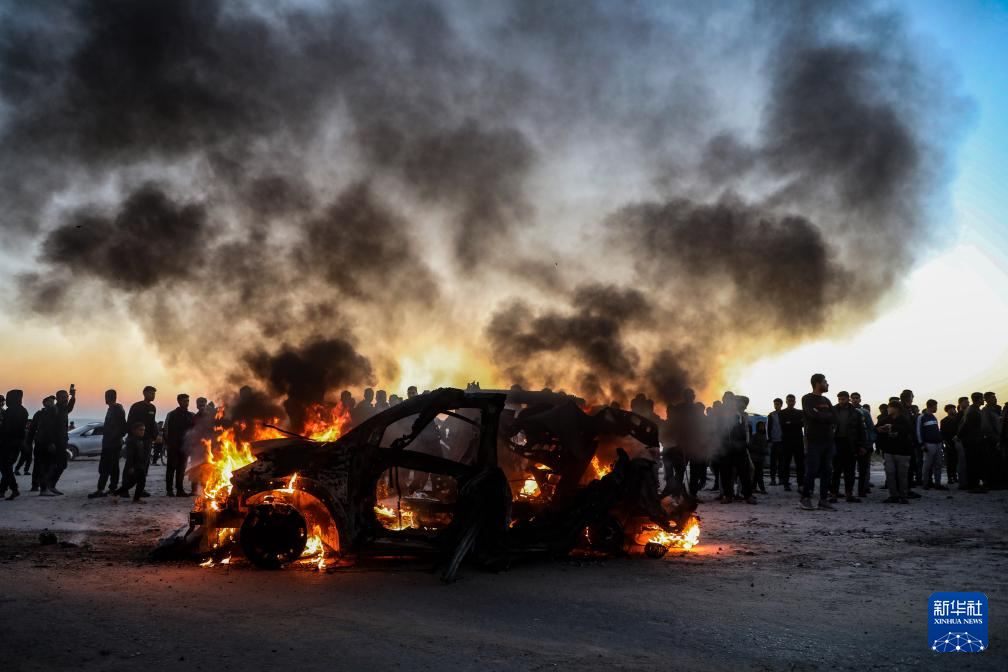 這是4月8日在加沙城拍攝的遭以軍空襲后起火的車輛,車內(nèi)一名半島電視臺記者遇難。新華社發(fā)(里澤克·阿卜杜勒賈瓦德攝)