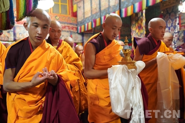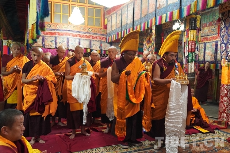 當(dāng)天清晨,扎什倫布寺桑煙繚繞、法號聲聲,28 位受戒的年輕僧人帶著新制袈裟,迎著朝霞依次走向拉讓殿等待班禪授戒這一神圣時刻的到來。8時許,在手持黃傘、香爐和吹嗩吶的高僧護(hù)送引領(lǐng)下班禪緩緩步入拉讓殿,并與在場僧眾集體誦經(jīng)。誦經(jīng)儀式結(jié)束后,班禪就坐于拉讓殿寶座,4名高僧大德作為授戒眾,開始為僧人閉門授戒、剃度、賜法名、摸頂。此時,受戒僧人一一入座,兩手在胸前交叉,聽班禪引證經(jīng)典告誡,并宣誓嚴(yán)守戒律。