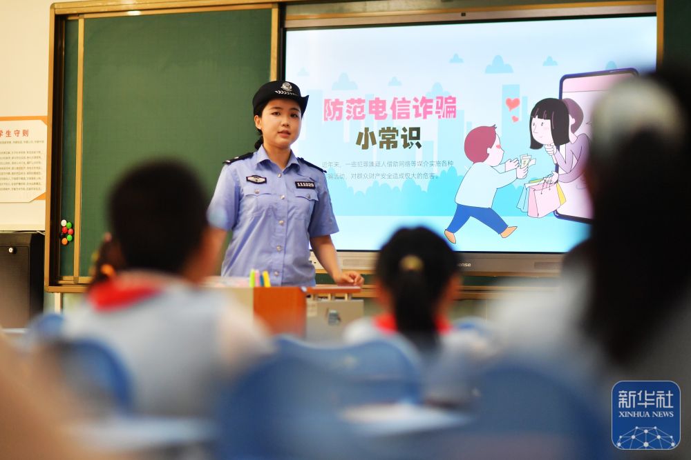 9月15日,在山東省榮成市府新小學教室內(nèi),轄區(qū)民警通過案例講解為學生們普及網(wǎng)絡安全和防詐騙知識。新華社發(fā)(李信君攝)
