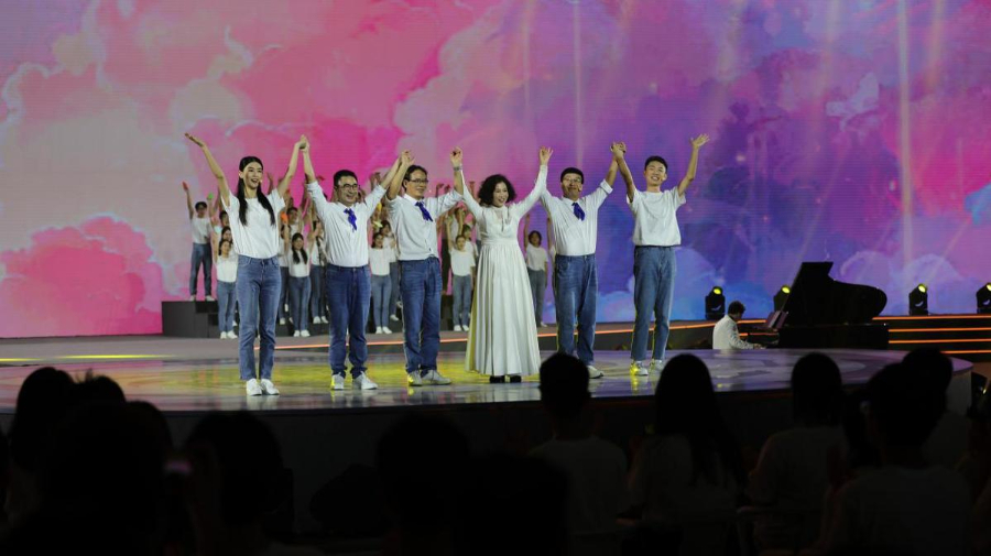 電子科技大學(xué)學(xué)生合唱團(tuán)與退休教職工組成的銀杏合唱團(tuán)共同演繹《一路生花》 楊曉恒攝