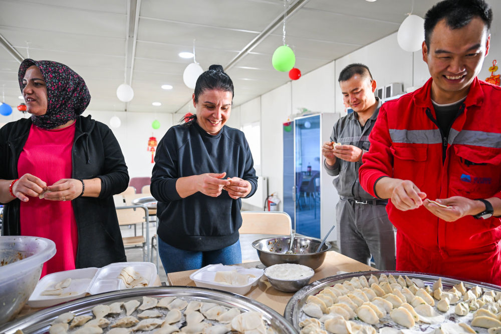2月16日,在土耳其阿克薩拉伊省圖茲湖地下天然氣儲庫擴(kuò)建項目二期工程營地,中土兩國職工在一起包餃子。新華社記者劉磊攝