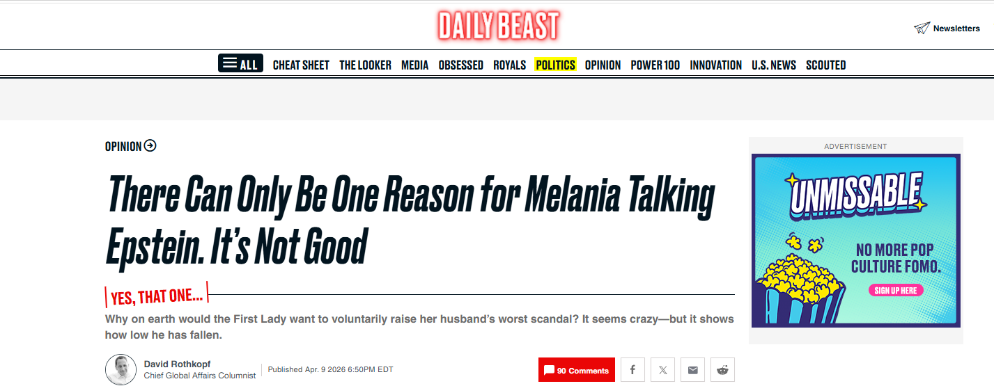 美國新聞網(wǎng)站《每日野獸》4月9日刊發(fā)題為《梅拉尼婭就愛潑斯坦案發(fā)聲只有一個原因,這原因可不妙》的評論性文章,作者是大衛(wèi)·羅斯科夫(David Rothkopf),文章摘編如下:
