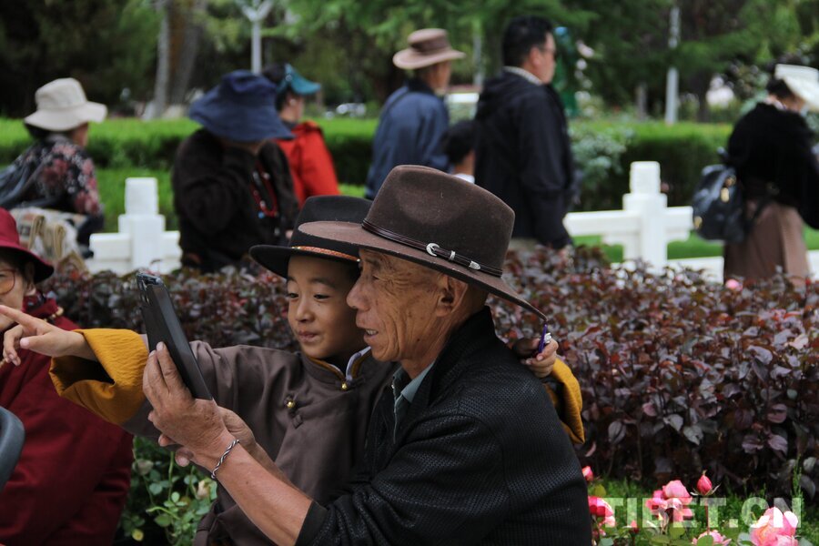 2025年8月24日雪頓節(jié),拉薩市的藏族爺孫倆在羅布林卡享受節(jié)日時光。攝影:趙釗