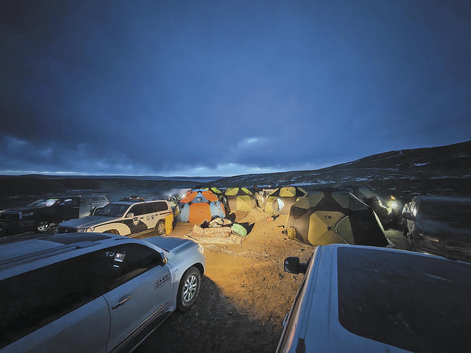 巡山夜幕下的營地。