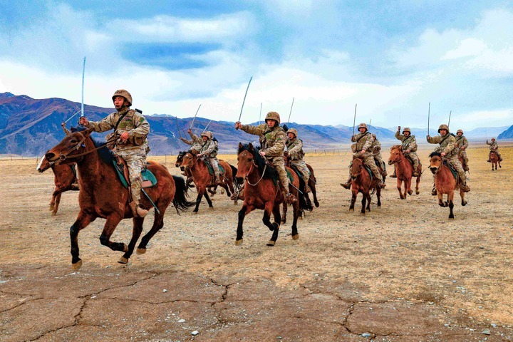 騎兵連官兵們一身戎裝,跨著戰(zhàn)馬,雪亮的馬刀在月光下閃著寒光。官兵們的眼神堅(jiān)毅而明亮,就像草原夜空中最亮的星。