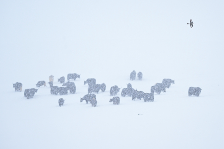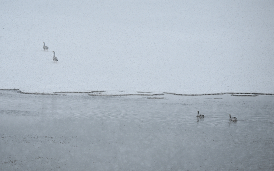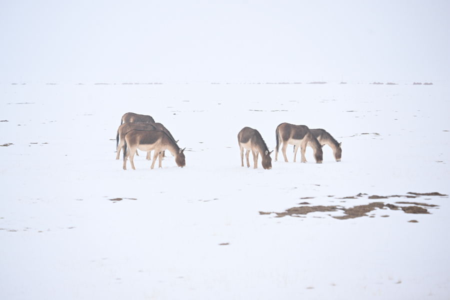 令人驚喜的是,風(fēng)雪中的源頭并不冷清。三五成群的藏野驢在緩坡上覓食,棕褐色的脊背上落滿雪花,卻走得從容不迫;幾只藏原羚從遠(yuǎn)處躍過(guò)雪地,靈巧的身影在風(fēng)雪中一閃而過(guò),很快消失;斑頭雁貼著湖面低飛,時(shí)而盤旋,時(shí)而鳧水。這樣的場(chǎng)景,在當(dāng)?shù)厣鷳B(tài)管護(hù)員看來(lái),已不罕見(jiàn)。