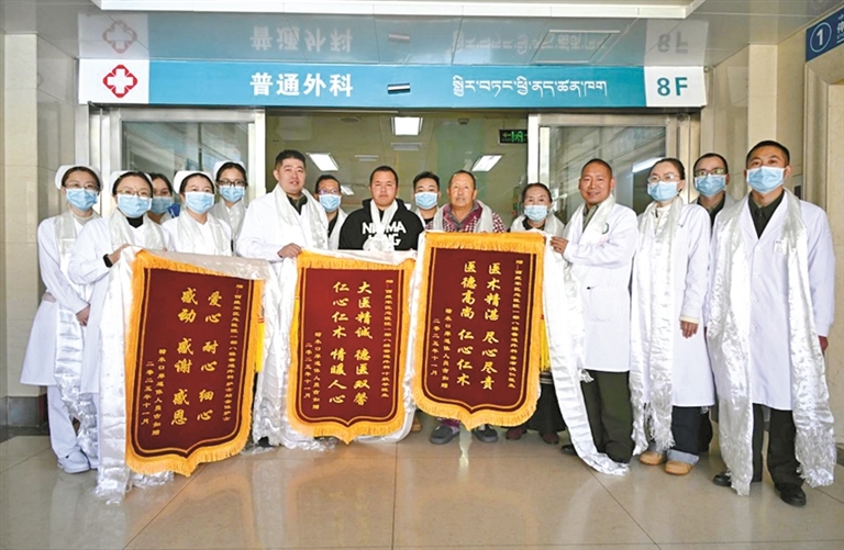 圖為患者出院時給西藏軍區(qū)總醫(yī)院普通外科醫(yī)療團隊贈送錦旗。通訊員 西培多杰 攝