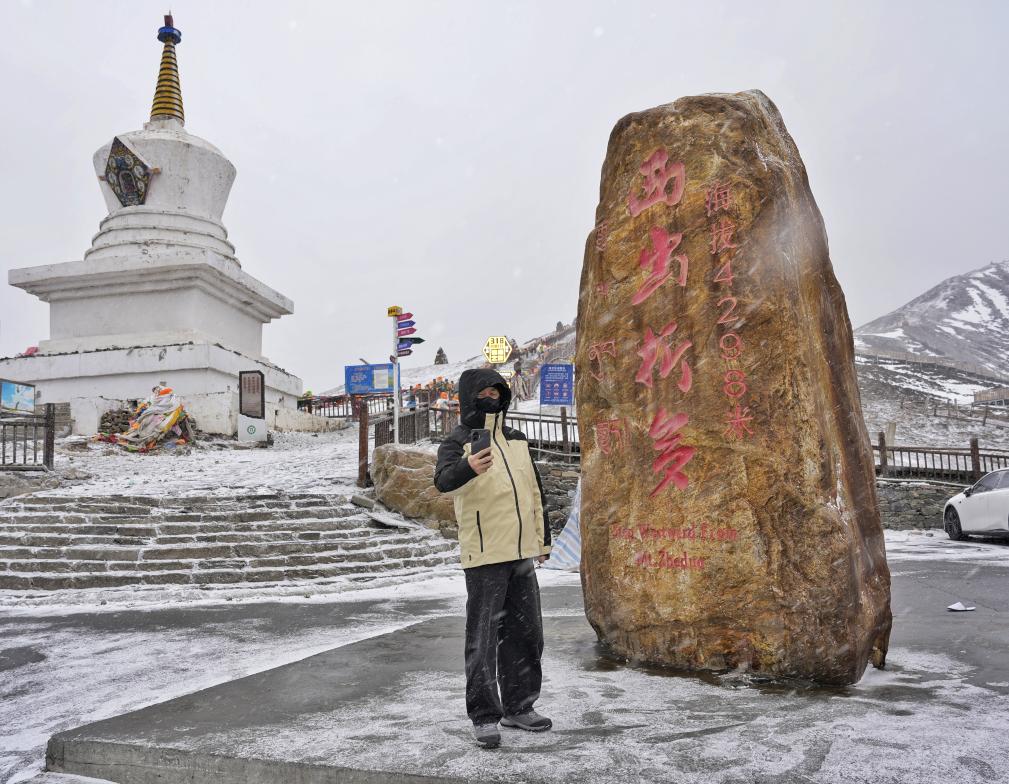 1月30日,游客正在折多山埡口處“西出折多”碑前打卡拍照。新華社記者劉坤 攝