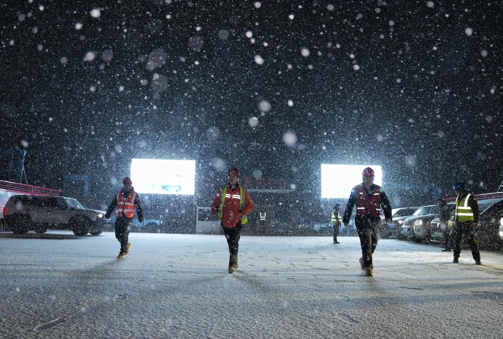 1月30日晚,折多山大雪紛飛,工人們在折多山隧道施工點位前。新華社記者劉坤 攝