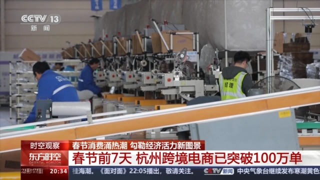 春節(jié)期間,在杭州跨境電商綜試區(qū),一排排貨架上整齊碼放著來自世界各地的“特產(chǎn)”,工作人員正在分揀、打包,一派繁忙景象。