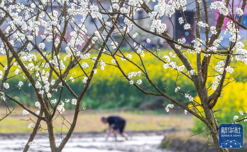 3月17日,在貴州省銅仁市玉屏侗族自治縣朱家場鎮(zhèn)混寨村,村民在李花間整地。新華社發(fā)(劉德軍攝)
