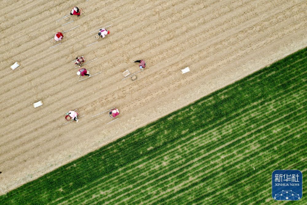 3月17日,河南省焦作市溫縣黃莊鎮(zhèn)南韓村農(nóng)民在田間種植鐵棍山藥(無人機(jī)照片)。新華社發(fā)(徐宏星攝)