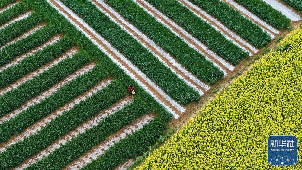 3月17日,在四川省閬中市白溪村,村民在給麥田里套栽的玉米苗施肥(無人機(jī)照片)。新華社發(fā)(王玉貴攝)
