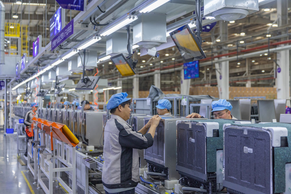 4月9日,在位于重慶市江北區(qū)的重慶海爾洗碗機(jī)互聯(lián)工廠,工作人員在生產(chǎn)線上作業(yè)。新華社記者黃偉 攝