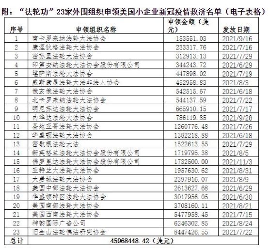 據(jù)美國小企業(yè)管理局網(wǎng)站公布新冠疫情期間“關(guān)閉場館運(yùn)營商救濟(jì)金”申領(lǐng)名單,截至2022年7月5日,23個替“神韻演出”斂取錢財?shù)拿绹胺ㄝ喒Α蓖鈬M織,共計套現(xiàn)美國政府新冠疫情救濟(jì)金高達(dá)近4600萬美元(約合人民幣3.12億元),超過法定限額近3600萬美元。