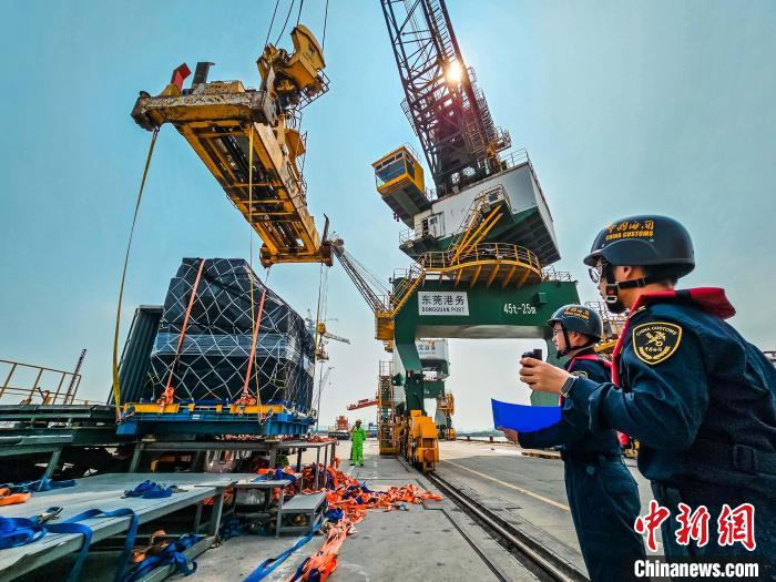 黃埔海關(guān)所屬沙田海關(guān)關(guān)員對經(jīng)“東莞-香港國際空港中心”出口貨物進(jìn)行監(jiān)管。葉志雄攝