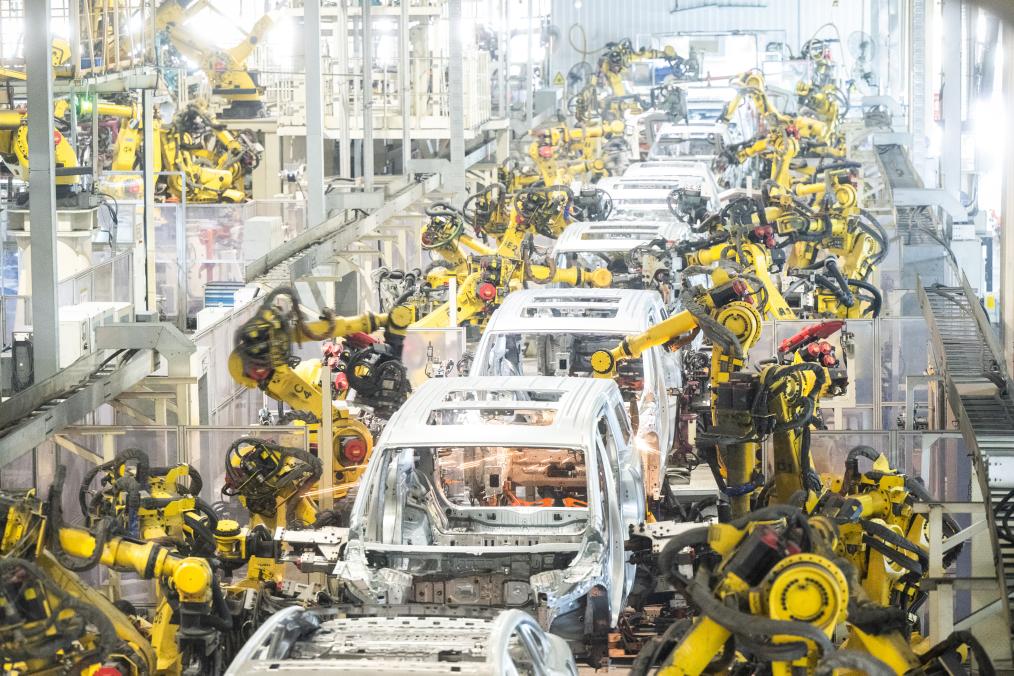 4月1日,在位于湖北武漢市經(jīng)開(kāi)區(qū)的嵐圖汽車(chē)電動(dòng)化焊裝車(chē)間,機(jī)器人在流水線上作業(yè)。新華社記者 肖藝九 攝