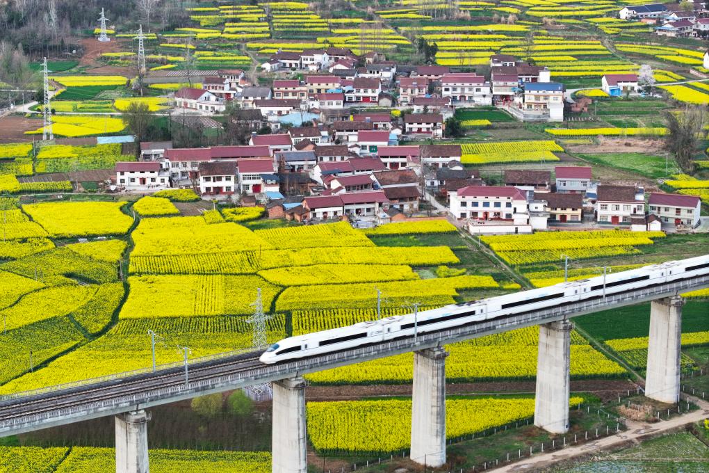 3月20日,西成高鐵線上的列車(chē)駛過(guò)陜西漢中市南鄭區(qū)陽(yáng)春鎮(zhèn)(無(wú)人機(jī)照片)。新華社記者 邵瑞 攝