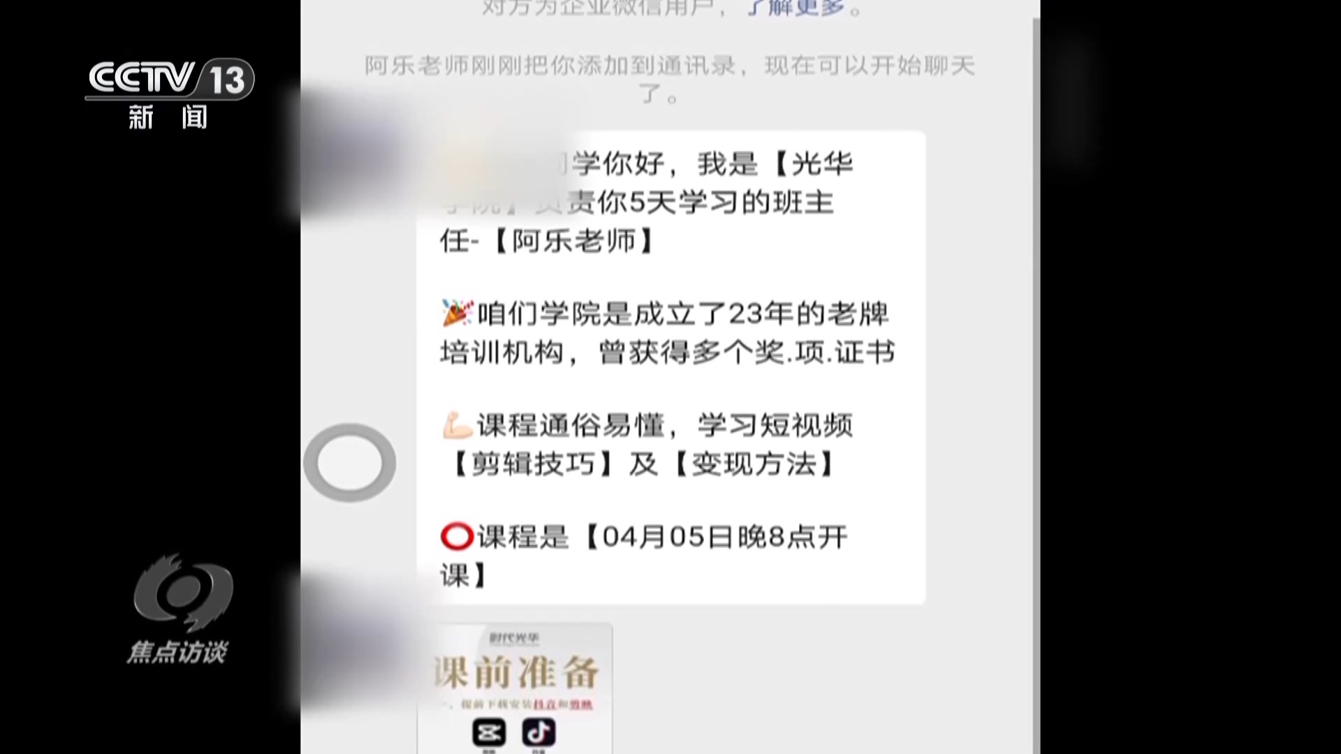 黃先生的遭遇并不是個(gè)案。記者瀏覽多個(gè)網(wǎng)絡(luò)平臺(tái),發(fā)現(xiàn)類似的廣告比比皆是,五花八門,0元學(xué)配音、0元學(xué)書法、0元學(xué)易經(jīng)……記者隨機(jī)點(diǎn)開了一家賬號(hào)主體為北京時(shí)代光華科技有限公司的0元5天剪輯直播課,添加所謂的老師微信之后就被拉進(jìn)了一個(gè)微信群,4月5日晚上8點(diǎn),課程開始了。