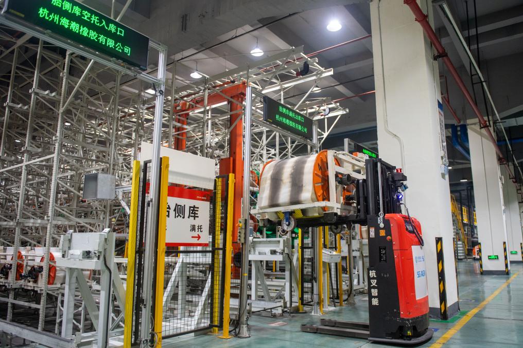 在杭州市錢(qián)塘區(qū)中策橡膠集團(tuán)股份有限公司未來(lái)工廠內(nèi),無(wú)人叉車(chē)在運(yùn)輸產(chǎn)品(2024年2月23日攝)。新華社記者 江漢 攝
