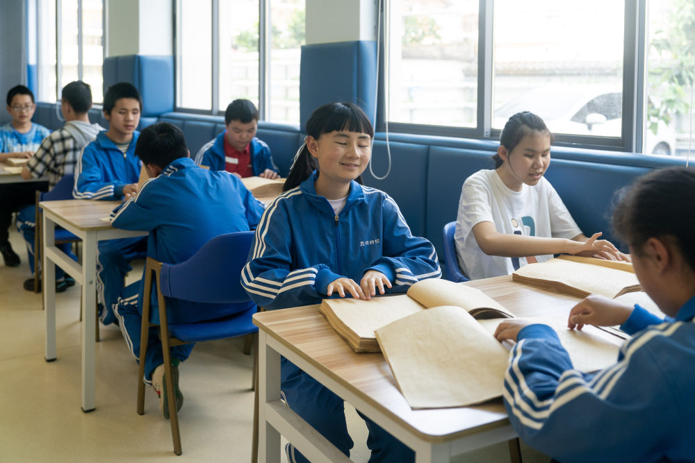 4月15日,昆明市盲啞學(xué)校的盲生們?cè)趯W(xué)校圖書室閱讀盲文書。(新華社記者 陳欣波 攝)