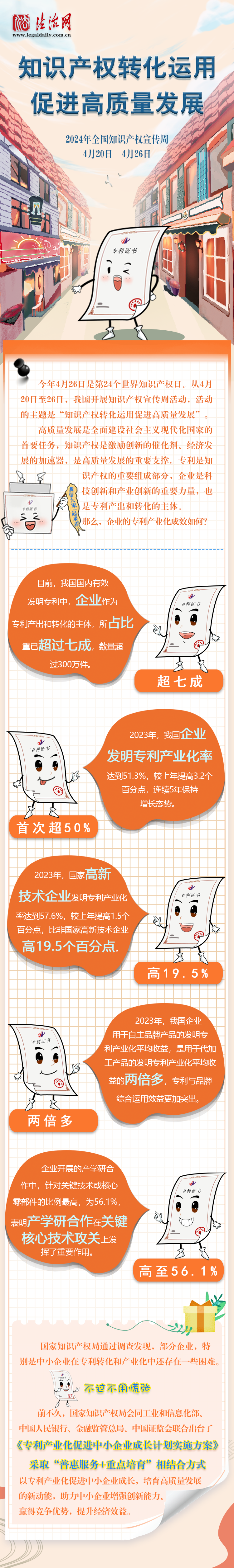 今年4月26日是第24個世界知識產(chǎn)權(quán)日。4月20日至26日,我國開展知識產(chǎn)權(quán)宣傳周活動,主題是“知識產(chǎn)權(quán)轉(zhuǎn)化運用促進(jìn)高質(zhì)量發(fā)展”。