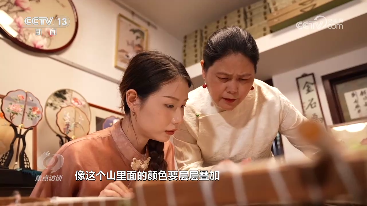盧建英是蘇州當?shù)赜忻奶K繡代表性傳承人。記者見到她的時候,她正在指導(dǎo)女兒刺繡。