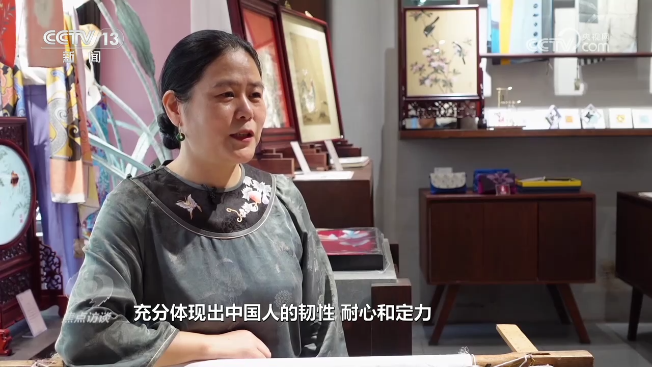 盧建英:“當時我在繡一幅《桃花太平鳥圖》,習(xí)近平總書記走到了我的繃架前。他說你好,很親切,很和藹,看得非常仔細。他說中華文化的傳承力有多強,通過這個蘇繡可以看出來,像這樣的功夫充分體現(xiàn)出中國人的韌性、耐心和定力,這是中華民族精神的一部分,能得到總書記的認可,真的是倍感榮耀?!?/p>