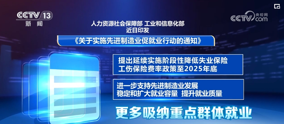 人力資源社會保障部、工業(yè)和信息化部印發(fā)《關(guān)于實(shí)施先進(jìn)制造業(yè)促就業(yè)行動的通知》,提出延續(xù)實(shí)施階段性降低失業(yè)保險(xiǎn)、工傷保險(xiǎn)費(fèi)率政策至2025年底,進(jìn)一步支持先進(jìn)制造業(yè)發(fā)展,穩(wěn)定和擴(kuò)大就業(yè)容量,提升就業(yè)質(zhì)量,更多吸納重點(diǎn)群體就業(yè)。