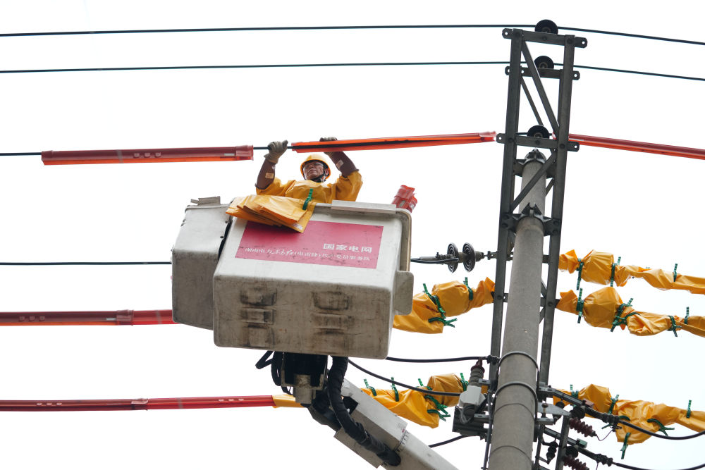 4月24日,賀彪在湖南省長沙市岳麓區(qū)一小區(qū)開展帶電作業(yè)。新華社記者 薛宇舸 攝