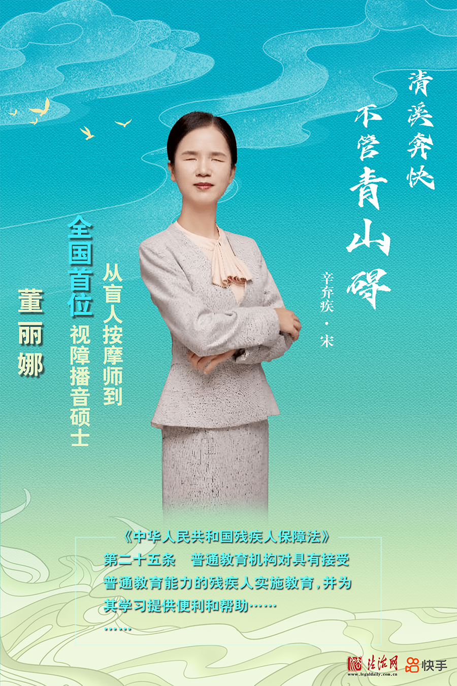 董麗娜先天弱視,10歲失明。但她自強不息、排除萬難,在22歲時爭取到視障人士播音培訓(xùn)機會,獲得一級甲等普通話證書,成為《麗娜品讀時間》的主持人。2020年考入中國傳媒大學(xué)攻讀碩士學(xué)位,2023年畢業(yè)成為全國首位視障播音碩士。