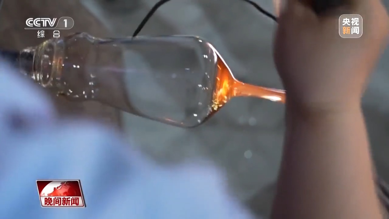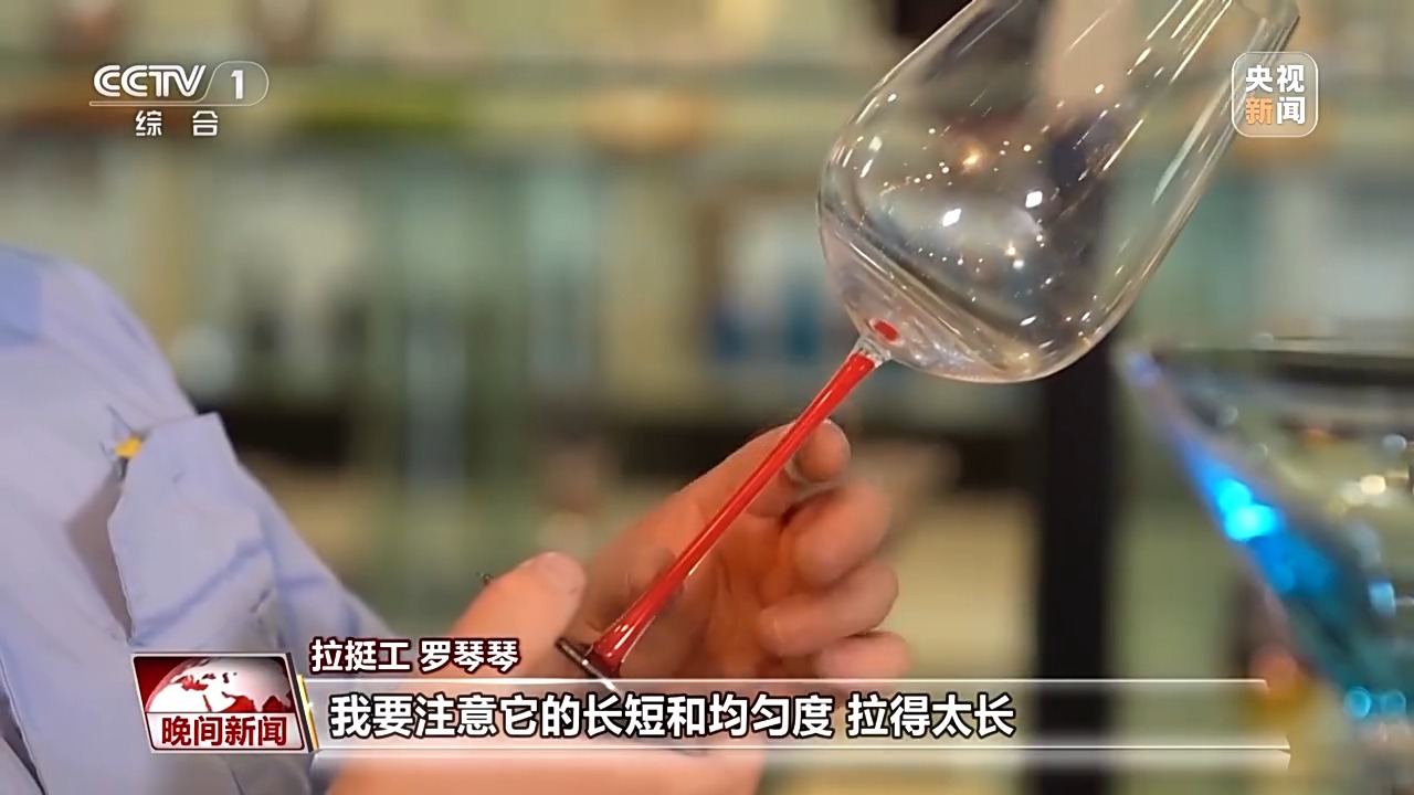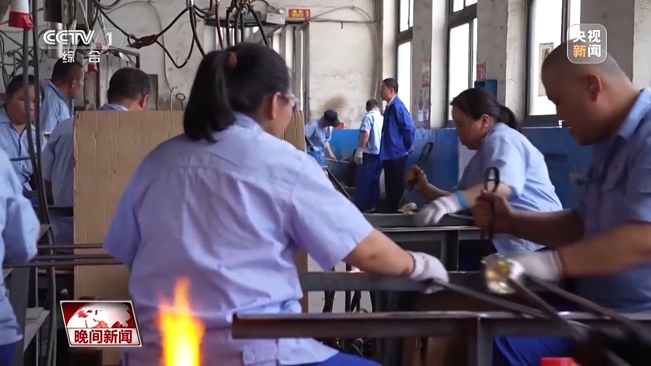 在素有“中國玻璃器皿之都”美譽的山西祁縣,人工吹制玻璃器皿的手藝被認(rèn)定為省級非遺。一團團紅彤彤的玻璃溶液,在數(shù)十位師傅手中傳來傳去,吹好杯身的毛坯,傳遞到拉挺師傅羅琴琴手中。