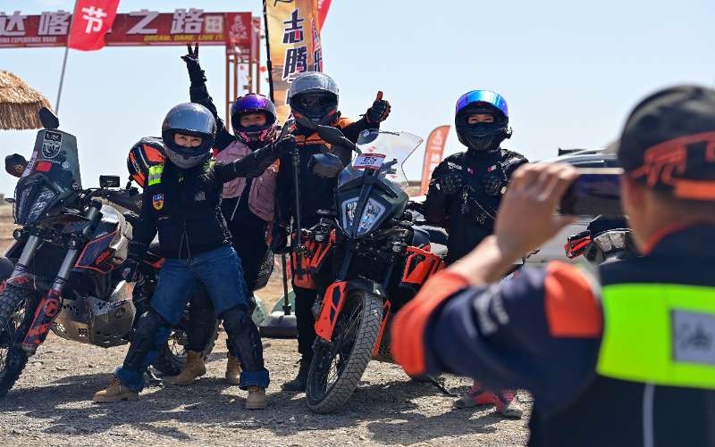 2024年5月1日,在新疆克拉瑪依市烏爾禾區(qū)世界魔鬼城景區(qū),車友在自駕線路起點合影。新華社記者 丁磊 攝