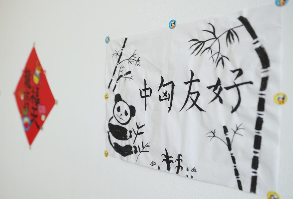 寫有“中匈友好”的小朋友畫作貼在匈中雙語學校教室墻上(2024年5月3日攝)。