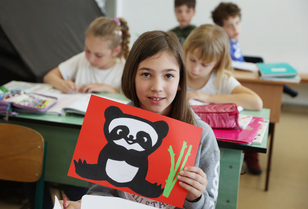 匈中雙語學校三年級學生寶怡展示自己的大熊貓形象美術作品(2024年5月3日攝)。