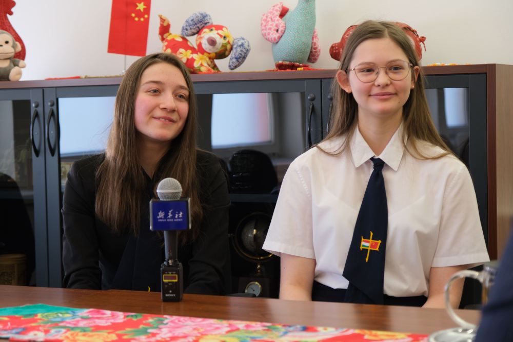 匈中雙語學校學生胡靈月(左)和宋智孝在匈牙利首都布達佩斯接受新華社記者采訪(2023年2月7日攝)。