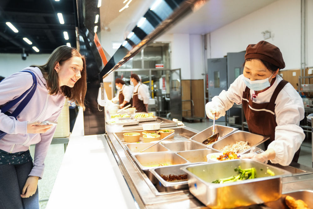 胡靈月在北京首都師范大學的食堂內(nèi)打飯(2024年4月28日攝)。
