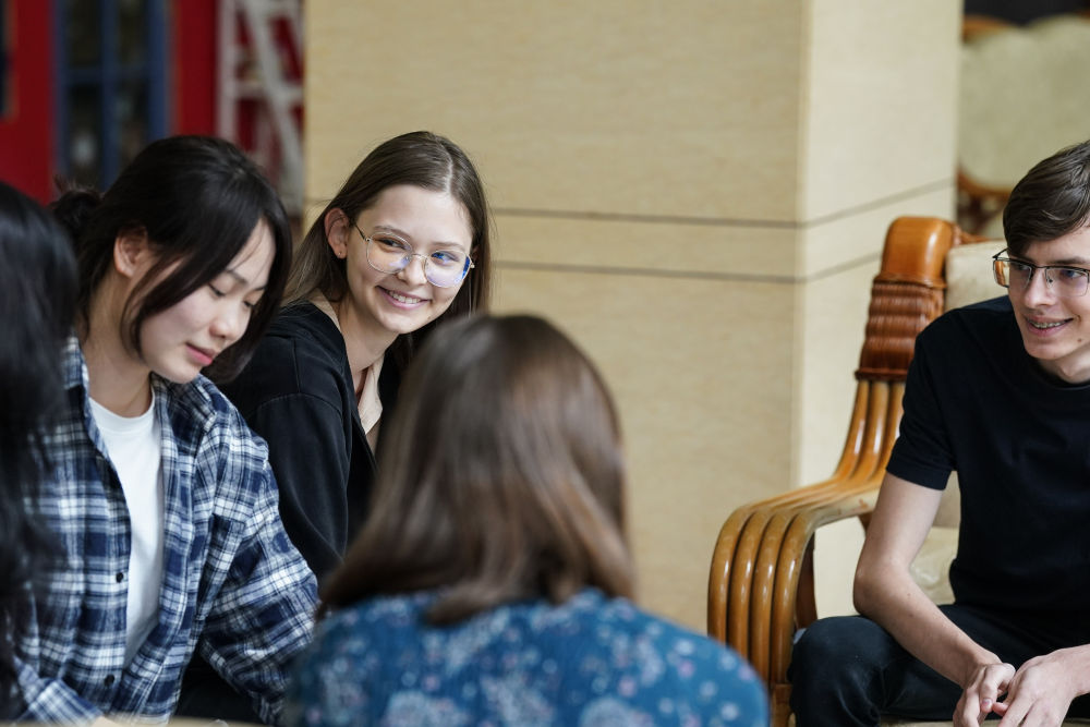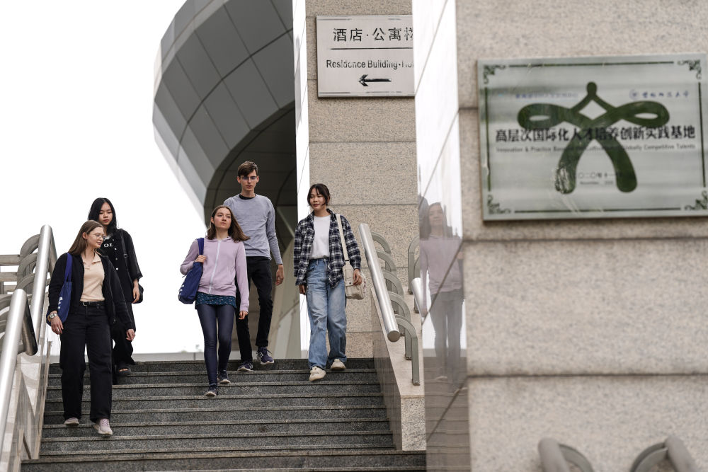 宋智孝(左二)在北京首都師范大學校園內(nèi)與同學交流(2024年4月28日攝)。