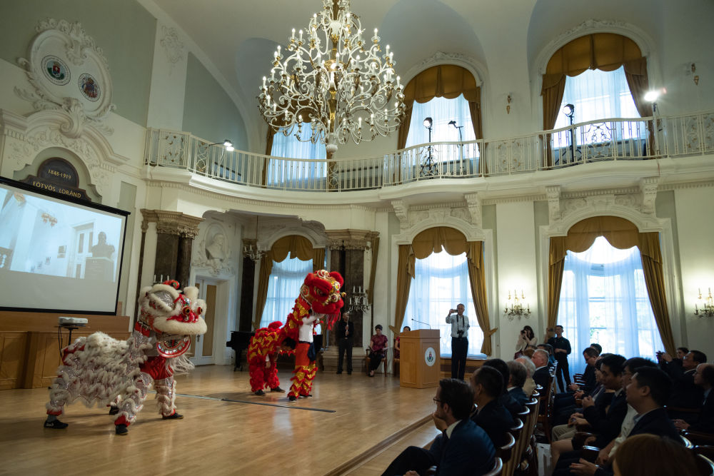 這是2022年6月21日在匈牙利布達佩斯舉行的羅蘭大學孔子學院成立15周年慶典上拍攝的舞獅表演。目前,匈牙利已開設5所孔子學院。