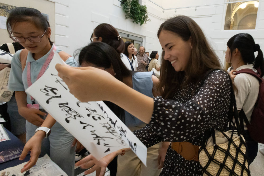 2023年8月29日,嘉賓在匈牙利布達佩斯“美美與共——中國匈牙利詩歌吟誦會”暨“漢字與中華文明”展上體驗中國書法。