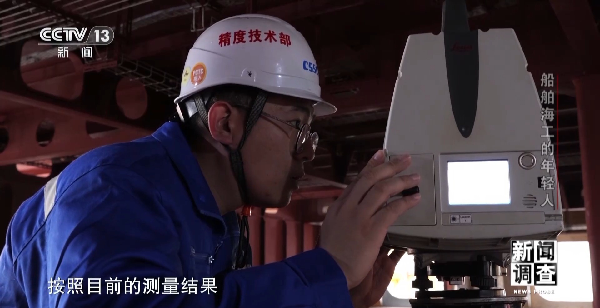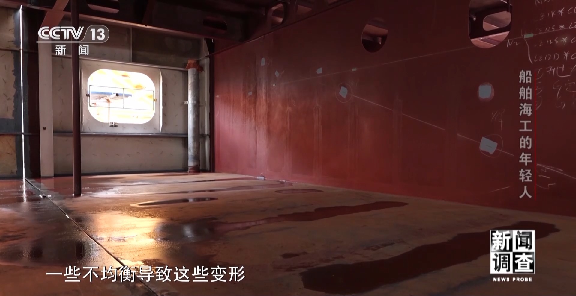 上海外高橋造船有限公司精度技術(shù)部副部長 孫建志:這個總段是典型的薄板結(jié)構(gòu),不平程度在正負15毫米之內(nèi)。所有的變形都是熱的影響,熱輸入以后就會產(chǎn)生殘余應(yīng)力,一些不均衡導(dǎo)致這些變形。尤其是薄板結(jié)構(gòu)更明顯,現(xiàn)在2號船的整體的平整度應(yīng)該相對1號船已經(jīng)好很多了。