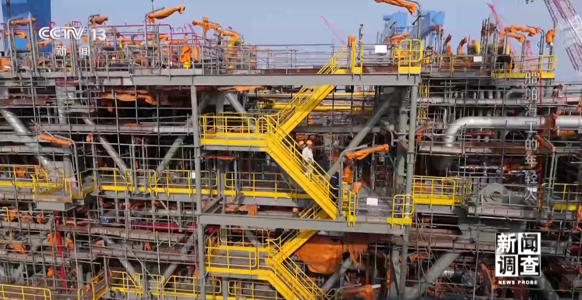 孫博文是啟東中遠海運海洋工程有限公司科技創(chuàng)新室的負責(zé)人,他帶記者登上了一個正在地面建設(shè)還未吊裝到平臺上的模塊。