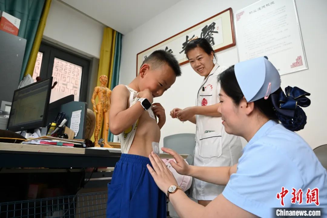 2023年7月11日,入伏首日,在內(nèi)蒙古呼和浩特市一醫(yī)院內(nèi),醫(yī)護(hù)人員為小朋友貼“三伏貼”。“三伏貼”是一種傳統(tǒng)的冬病夏治療法。劉文華 攝