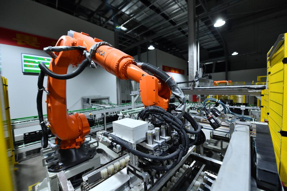 在廣西柳州市一家新能源汽車電池生產企業(yè),機器人在生產線上作業(yè)(2023年5月10日攝)。新華社記者黃孝邦攝